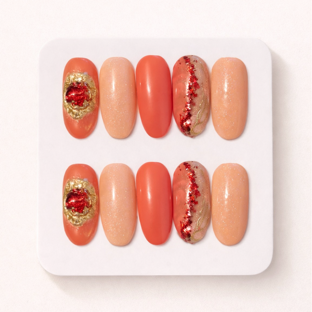 Ce set de press on nails, à un design lumineux et raffinée inspiré des couleurs chaudes du corail et d l'éclat des pierres précieuses.