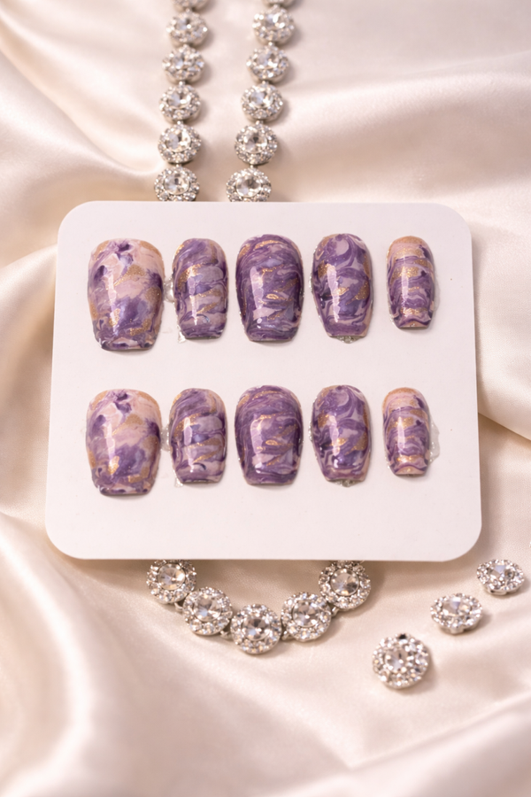 Ce set de press on nails, est inspiré de la beauté des pierres semi précieuses, Améthyste Royale révèle un motif marbré violet profond délicatement traversé par des touches dorées lumineuses. Chaque ongle rappelle la texture naturelle de l'améthyste, créant une manucure sophistiquée et élégante.